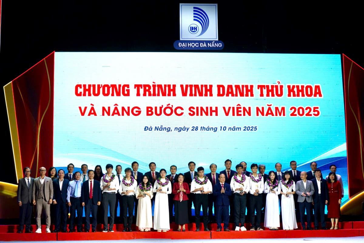 Tối 28-10, tại Nhà hát Trưng Vương, Đại học (ĐH) Đà Nẵng long trọng tổ chức “Chương trình Vinh danh Thủ khoa và Nâng bước sinh viên năm 2025”, nhằm tôn vinh các Thủ khoa của các cơ sở đào tạo thành viên, tuyên dương sinh viên tiêu biểu trong năm học 2024-2025 và trao học bổng hỗ trợ sinh viên có hoàn cảnh khó khăn. Tham dự chương trình có Trưởng Ban Tuyên giáo và Dân vận Thành ủy Đà Nẵng Huỳnh Thị Thùy Dung cùng lãnh đạo các sở, ngành, ĐH Đà Nẵng và đông đảo sinh viên.