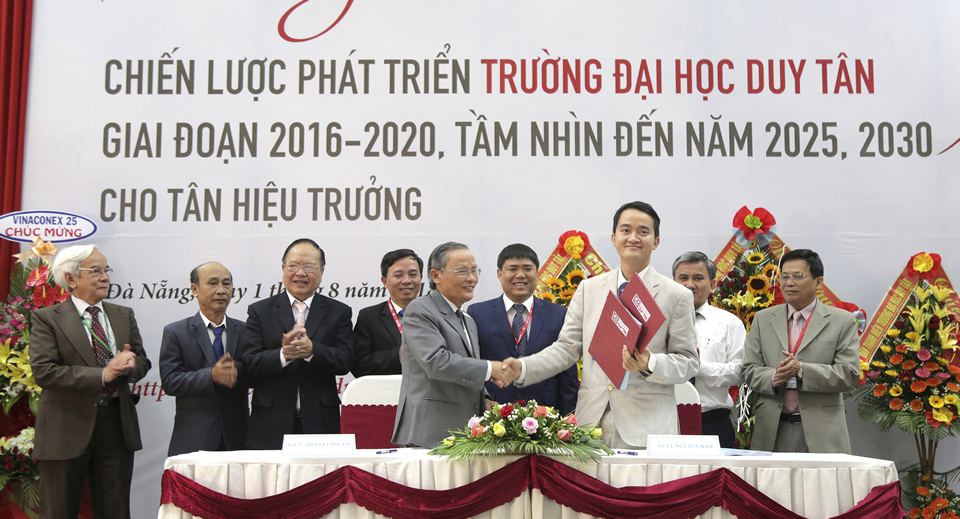 TS Lê Nguyên Bảo - tân Hiệu trưởng ĐH Duy Tân (bên phải, hàng trước) tiếp nhận Chiến lược Phát triển trường ĐH Duy Tân. |