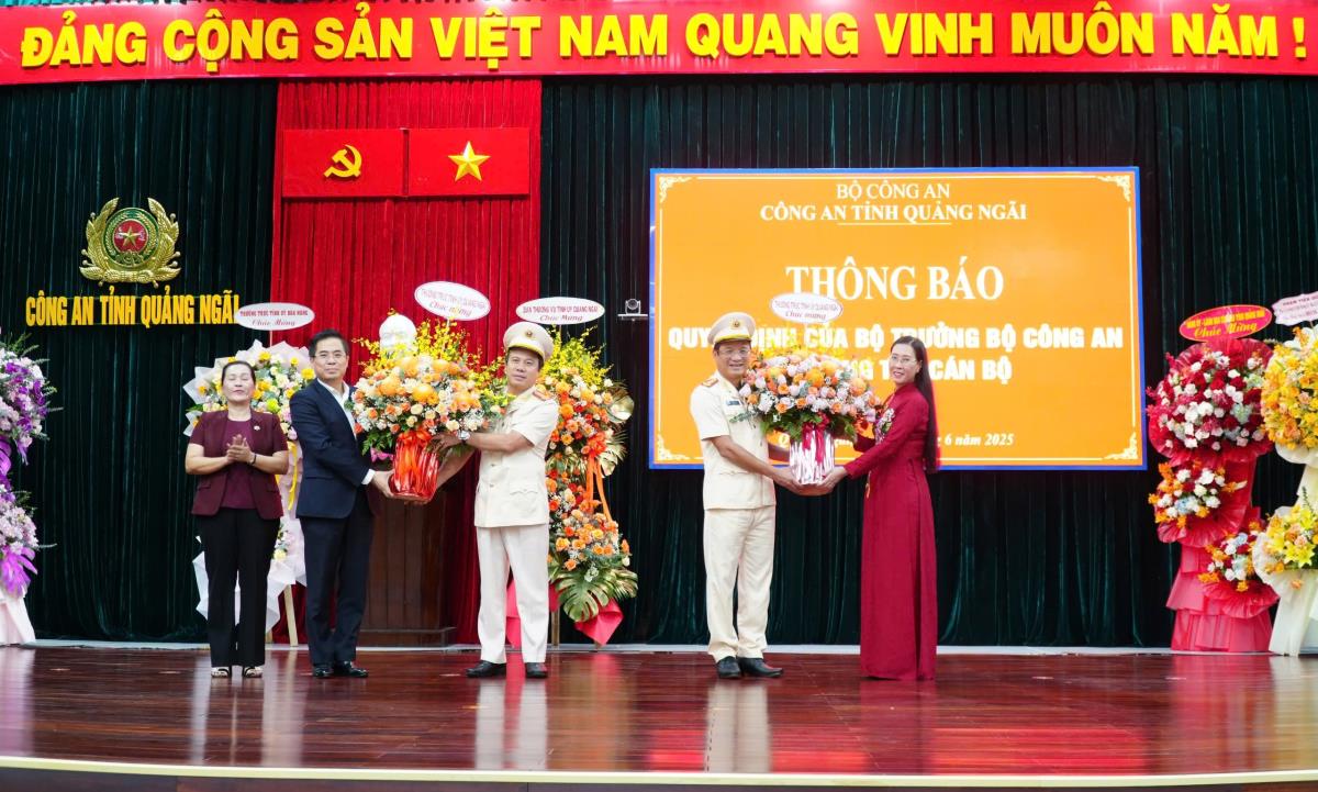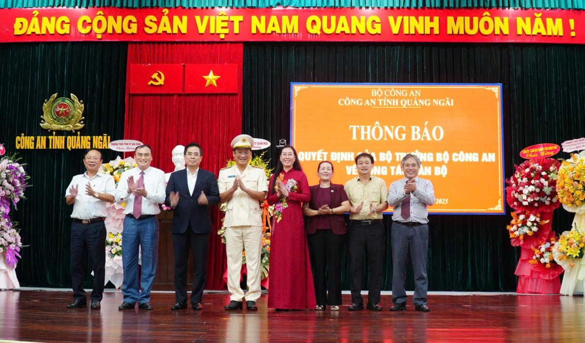 Tại buổi lễ, đại diện phòng Tổ chức cán bộ Công an tỉnh Quảng Ngãi thông báo quyết định của Bộ trưởng Bộ Công an về việc điều động Đại tá Hồ Song Ân- Giám đốc Công an tỉnh Đắk Nông đến nhận công tác và giữ chức vụ Giám đốc Công an tỉnh Quảng Ngãi.