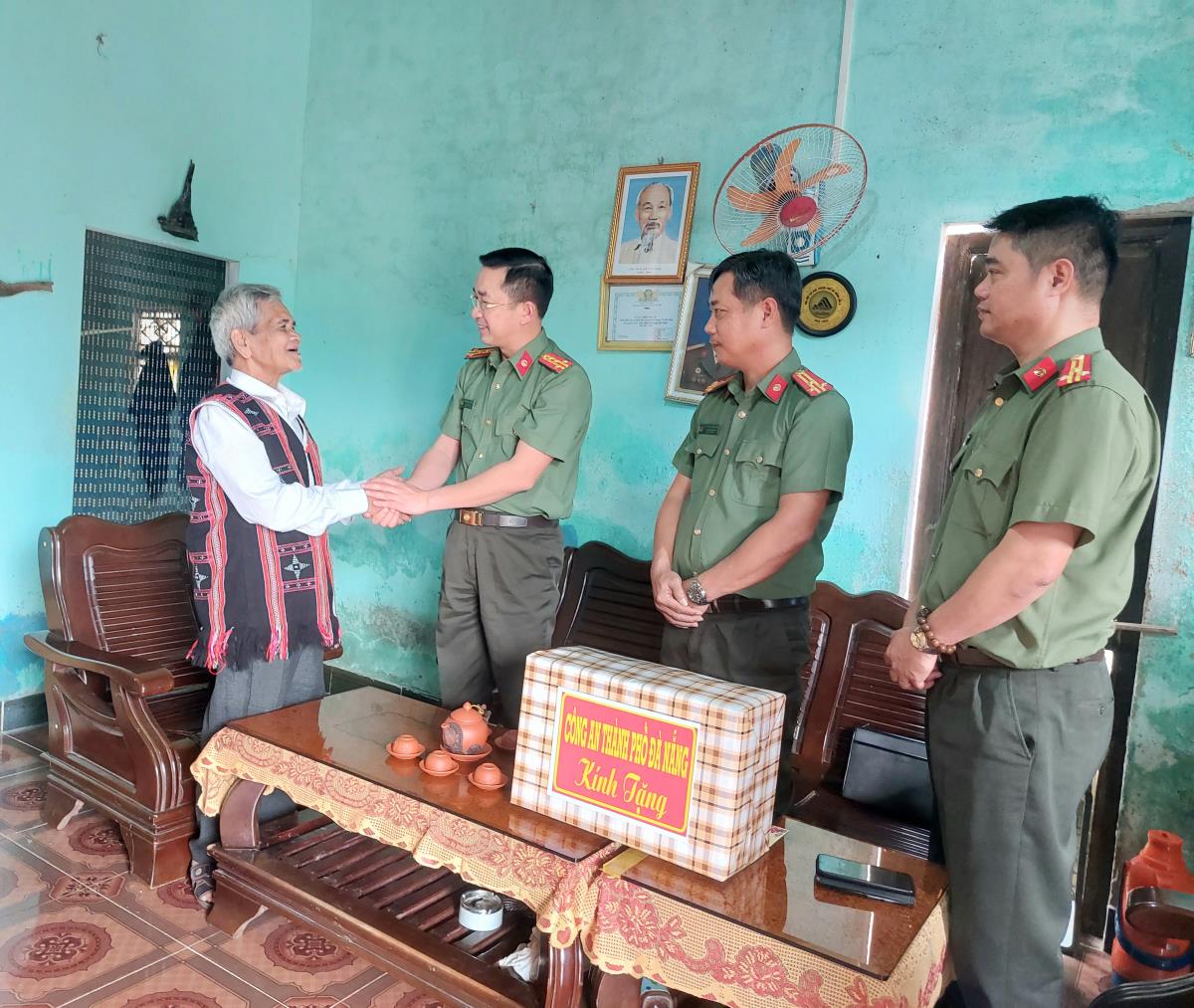 Thay mặt Đảng ủy, Ban Giám đốc Công an TP Đà Nẵng, Đại tá Nguyễn Đajai Đồng tặng quà đầu Xuân mới cho ông Lê Văn Nghĩa và già làng Đinh Văn Trí