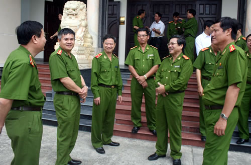 Đại tá Nguyễn Đình Chính (thứ 2 từ phải qua) trong buổi gặp gỡ, trao đổi kinh nghiệm phá Chuyên án 122T cùng lãnh đạo Tổng cục Cảnh sát PCTP và CA 16 tỉnh thành.