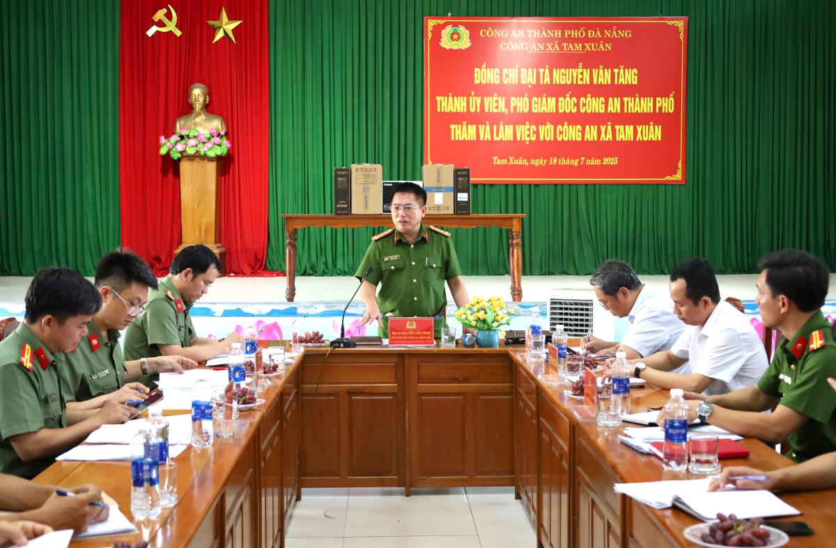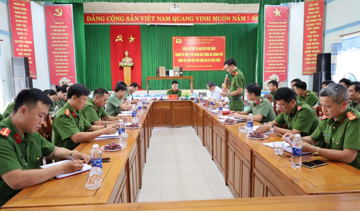 Nhằm kiểm tra, đánh giá tình hình thực hiện việc sáp nhập Công an xã cũng như thăm hỏi, động viên cán bộ, chiến sĩ (CBCS), sáng nay (18-7), đoàn công tác của Công an TP Đà Nẵng do Đại tá Nguyễn Văn Tăng – Thành ủy viên, Phó Giám đốc Công an thành phố dẫn đầu đã có buổi làm việc với Công an xã Tam Xuân. Tham dự buổi làm việc có ông Lê Văn Sinh – Bí thư Đảng ủy xã, ông Nguyễn Chí Dân – Chủ tịch UBND xã Tam Xuân.