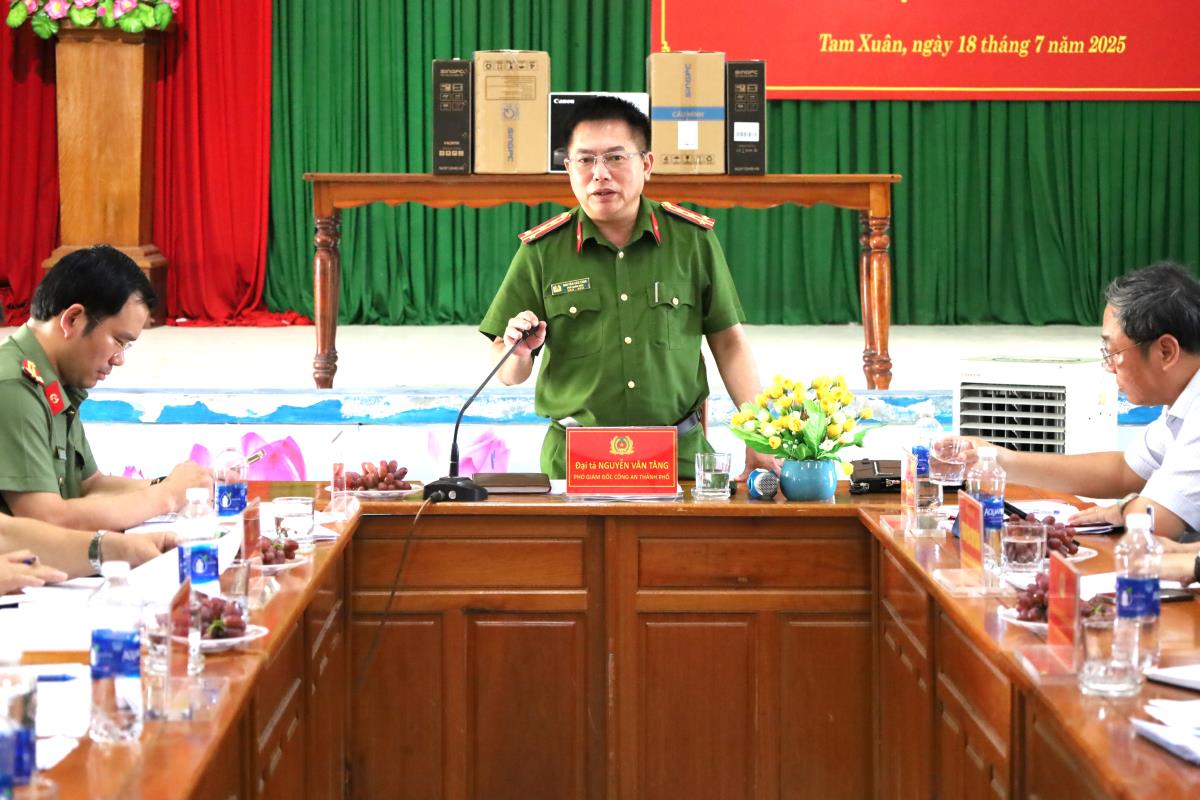 Tại buổi làm việc, Đại tá Nguyễn Văn Tăng ghi nhận, biểu dương những nỗ lực của CBCS Công an xã Tam Xuân trong thời gian qua. Thời gian đến, Đại tá Nguyễn Văn Tăng đề nghị tập thể Công an xã Tam Xuân nêu cao tinh thần đoàn kết, tập trung chỉ đạo, lãnh đạo để bộ máy hành chính hoạt động thông suốt, hiệu quả; rà soát, đánh giá chuyên môn CBCS để phân công nhiệm vụ cho phù hợp công việc; siết chặt kỷ luật, kỷ cương; tổ chức rà soát, kiểm đếm công tác tiếp nhận bàn giao tài liệu, vũ khí, công cụ hỗ trợ từ đơn vị cũ chuyển giao. Rà soát các nhiệm vụ, chỉ tiêu công tác những tháng cuối năm để có kế hoạch thực hiện; đồng thời triển khai lực lượng đảm bảo an toàn tuyệt đối Đại hội Đảng bộ các cấp.