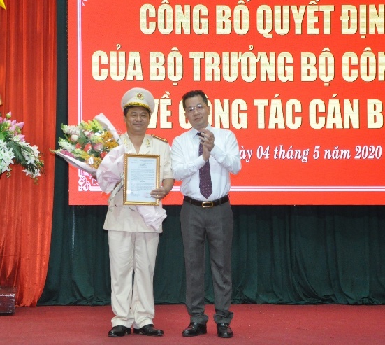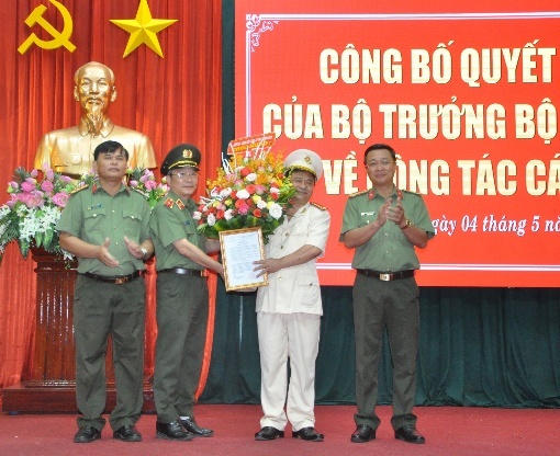 Thiếu tướng Vũ Xuân Viên trao Quyết định của Bộ trưởng Bộ CA cho Đại tá Phan Văn Dũng. |