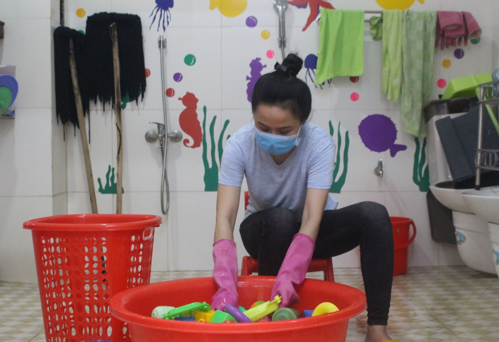 Giáo viên Trường Mầm non Tây Nguyên vệ sinh trường lớp, đồ chơi của trẻ trong thời gian nghỉ dịch. Ảnh: ĐL