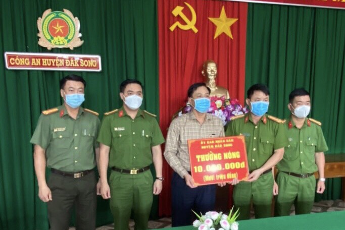 Lãnh đạo UBND huyện Đắk Song trao thưởng cho tập thể Công an huyên Đak Song về thành tích xuất sắc trong việc liên tiếp đấu tranh triệt phá các vụ án hình sự, kinh tế, ma túy trong thời gian ngắn.