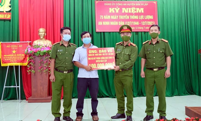 Ngày 17/7, tin từ Công an huyện Đắk R’lấp, tỉnh Đắk Nông cho biết, thông qua Công an huyện, ông Đào Vũ, trú tại xã Nghĩa Thắng, huyện Đắk R’lấp đã ủng hộ số tiền 100 triệu đồng cho Ban Chỉ đạo phòng, chống dịch bệnh ở người huyện Đắk R’lấp.