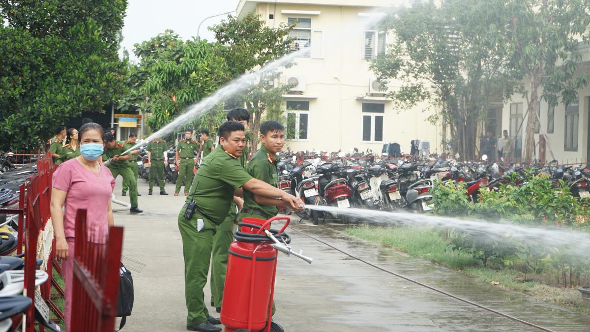 Theo tình huống giả định, đám cháy xảy ra tại nhà tạm giữ phương tiện xe máy, nguyên nhân cháy do chập điện bình ác quy của xe máy. Ngọn lửa bắt nhiều chất dễ cháy trong bãi xe nên bùng phát dữ hội, có nguy cơ cháy lan ra toàn bộ bãi xe. Ngay sau khi phát hiện cháy, đơn vị quản lý kho tạm giữ tang vật, phương tiện là Đội Cảnh sát Thi hành án hình sự và Hỗ trợ tư pháp đã huy động CBCS nhanh chóng sử dụng bình chữa cháy xách tay và nước từ họng chữa cháy vách tường dập lửa. Đội Cảnh sát PCCC và CNCH Công an quận cũng tổ chức lực lượng đến hỗ trợ, ngăn cháy lan.