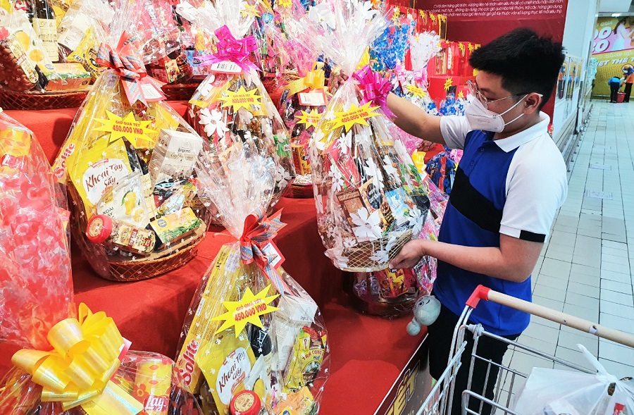Một khách hàng lựa chọn mua giỏ quà tết để làm quà biếu cho dịp tết Nhâm Dần sắp đến.