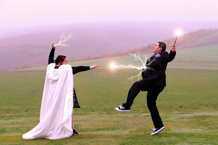 (Cadn.com.vn) - Emma Berry, 28 tuổi, và Ben Shields, 30 tuổi tổ chức đám cưới thực sự huyền diệu theo phong cách Harry Potter. Cặp đôi mặc trang phục phù thủy và sử dụng đũa phép đấu với nhau. Nhẫn cưới được đặt trong cuốn Harry Potter & Hoàng tử lai. Khách mời cũng mặc trang phục theo phong cách loạt truyện nổi tiếng này.