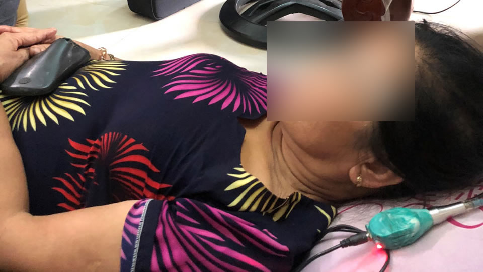Khách hàng nằm dưới nền nhà khi thực hiện phun xăm chân mày. |
