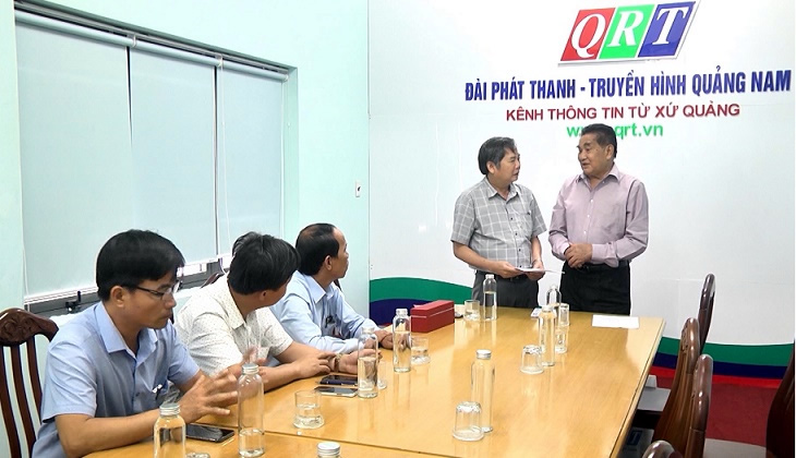 Ông Mai Văn Tư - Giám đốc, Tổng Biên tập Đài PT-TH Quảng Nam trò chuyện cùng đạo diễn Trần Vịnh trong buổi trao tặng phim. |
