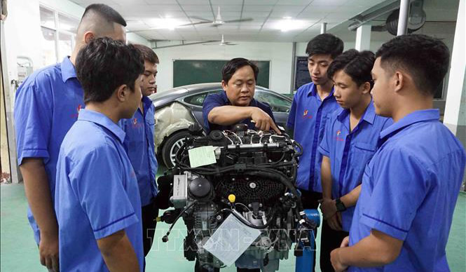 Học sinh Trường Cao đẳng Lý Tự Trọng trong giờ thực hành tại xưởng động cơ. |