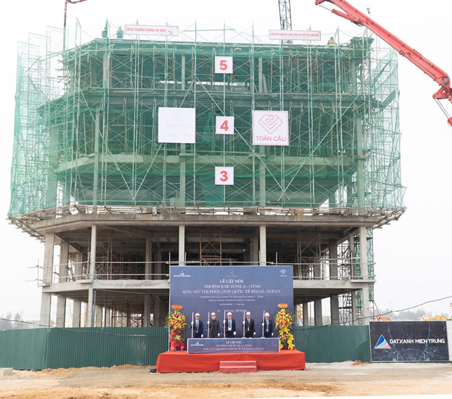 Mới đây, ngày 15/1, Đất Xanh Miền Trung vừa tiến hành cất nóc phân khu shophouse Zone A - The Ocean Khu đô thị Phức hợp Quốc tế Regal Ocean.