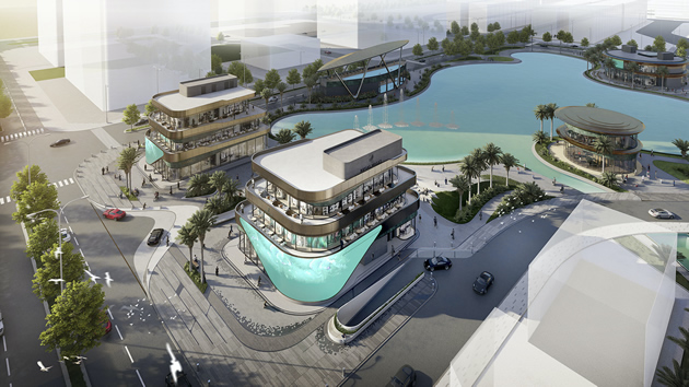 Phối cảnh 3D của phân khu cất nóc. Toàn dự án bao gồm 5 tòa tháp 30-39 tầng tích hợp trung tâm thương mại, khách sạn Novotel 5 sao quốc tế, căn hộ ở; khu thấp tầng với shophouse, villa.