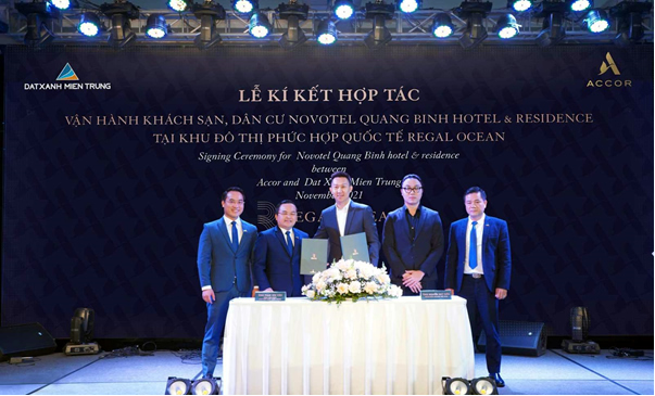 Sự kiện ký kết hợp tác vận hành của Đất Xanh Miền Trung với thương hiệu danh tiếng Accor cho tòa Novotel Quang Binh Hotels & Residences hồi tháng 11/2021.