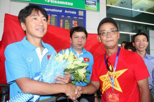 | HLV Miura nhận hoa và sự chào đón nồng hậu của CĐV Việt Nam khi cùng U23 Việt Nam trở về sau hành trình vòng loại Châu Á thành công. Ảnh: T.P |