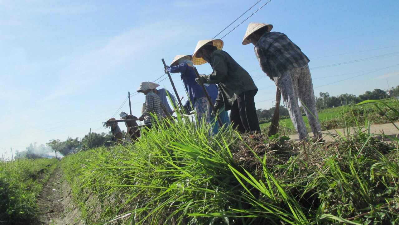 Phụ nữ xã Hòa Phong làm sạch đường làng, gìn giữ cảnh quan, môi trường nông thôn mới. |