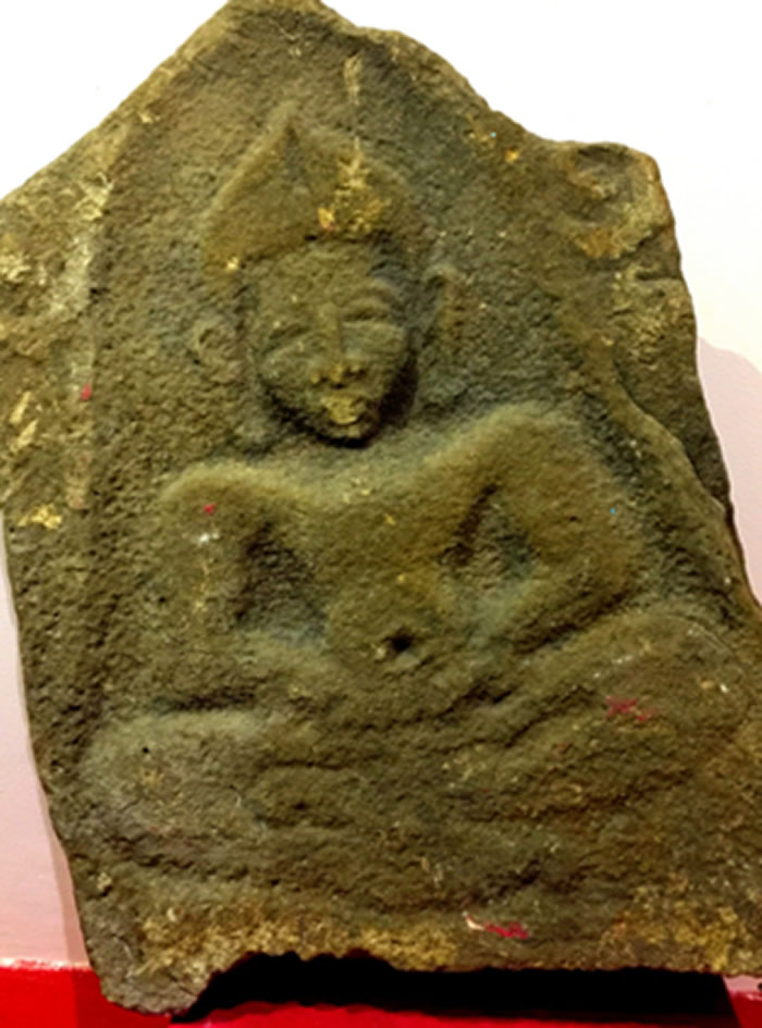 Phù điêu tạc hình một pho tượng Phật cao 44cm trên một phiến sa thạch hình chữ nhật màu xanh xám. Xung quanh tượng Phật là khung diềm hình lá bồ đề đường kính 36x23x50cm. Tượng Phật thể hiện tư thế tọa thiền khi đức Phật đi đến giác ngộ, Ngài xếp bằng, 2 tay đặt trước bụng, ngón tay duỗi thẳng, gan bàn tay ngửa lên trên. Bức phù điêu được tạc dù không mềm mại nhưng vẫn thể hiện được khuôn mặt hình trái xoan, đôn hậu, cặp lông mày rậm, dài cong xuống đôi mắt, sống mũi cao, thẳng, môi dày và khép vào nhau. Hai tai to và dài xuống tận cằm. Đầu tượng đội mũ chóp hình cánh sen, giữa trán tượng gần với vành mũ có 1 dấu chấm tròn nổi nằm trong một vòng tròn. Phần thân tượng Phật thể hiện bức tượng mình trần, bụng to, bờ vai nhô cao lên tạo thế cổ tượng bị rụt lại…