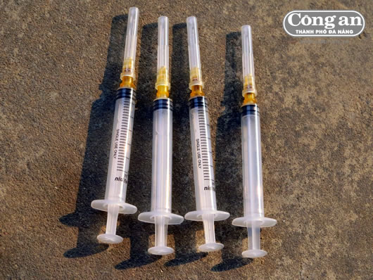 Bơm tiêm và hung khí thu được tại nhà ông Sinh. |