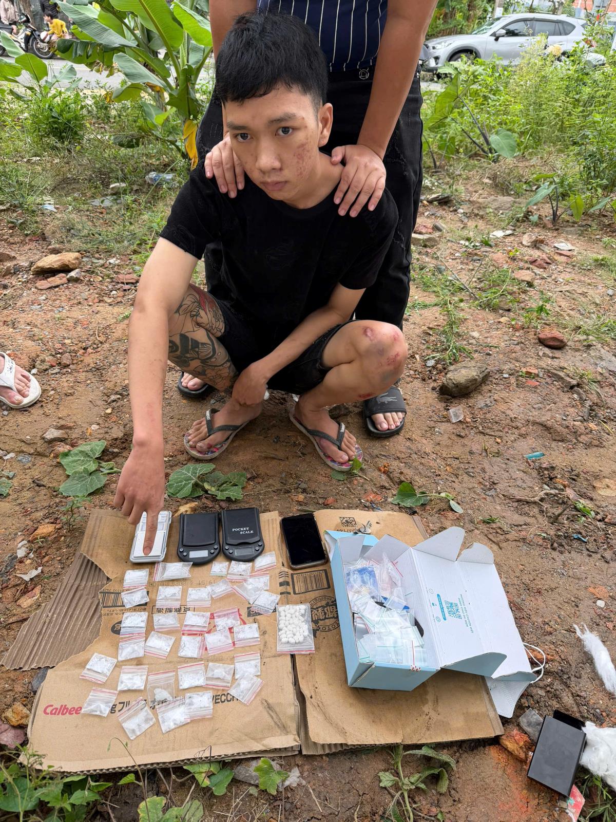Trước đó, khoảng 13 giờ ngày 14-12, Phòng CSMT phối hợp với Công an phường Ngũ Hành Sơn (Đà Nẵng) tiến hành kiểm tra hành chính chỗ ở của đối tượng Trần Đức Mỹ (2005, trú tổ 226, phường Ngũ Hành Sơn). Khi phát hiện lực lượng Công an, Trần Đức Mỹ nhanh chóng phi tang một hộp giấy xuống lô đất trống bên trái nhà. Tuy nhiên, hành vi của đối tượng không thể qua mắt được các trinh sát.