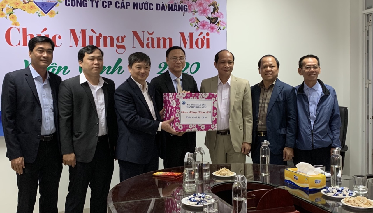 Đồng chí Đặng Việt Dũng, Ủy viên Ban Thường vụ Thành ủy, Phó Chủ tịch Thường trực UBND TP Đà Nẵng và đồng chí Võ Tấn Hà, Phó Giám đốc Sở xây dựng TP Đà Nẵng trao quà Tết cho lãnh đạo Dawaco. |