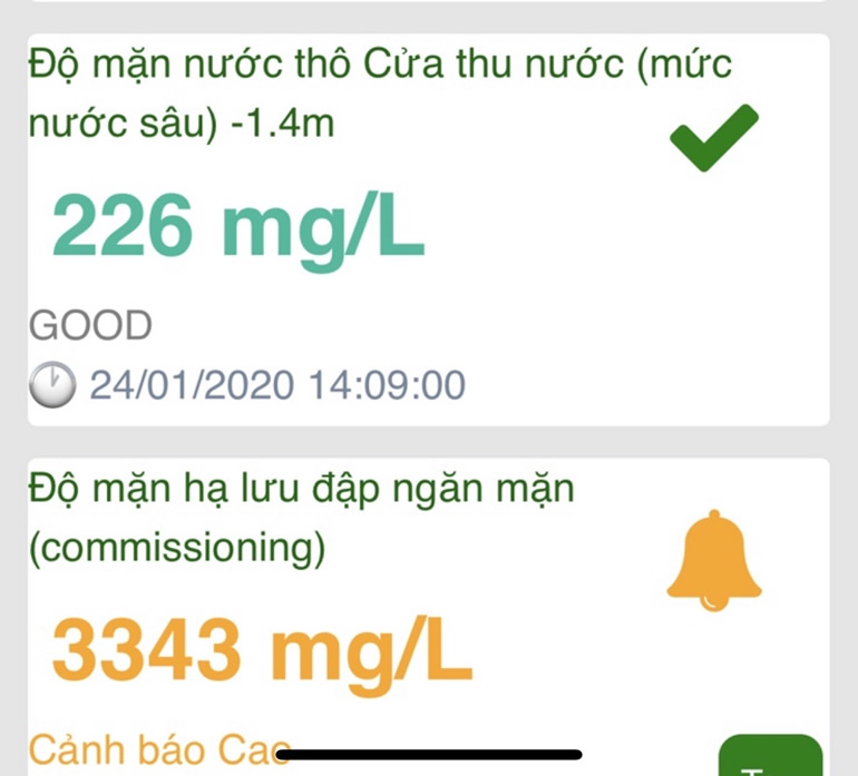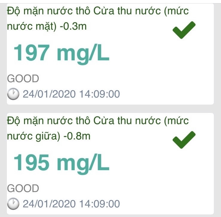 Số liệu theo dõi độ mặn tại cửa thu nước Cầu Đỏ và tại hạ lưu đập ngăn mặn ngày 24/1/2020 (Nhằm ngày 30 Tết). |