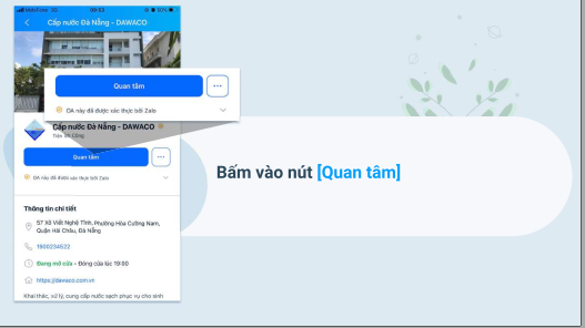 Theo đó, Khách hàng sử dụng nước của DAWACO chỉ cần vài bước thao tác đơn giản trên tài khoản ZaloOA: Cấp nước Đà Nẵng – DAWACO như sau: