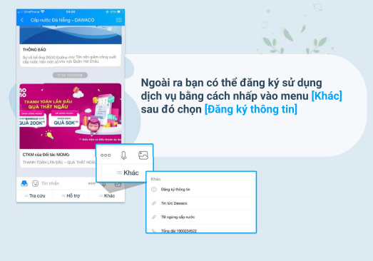 Nằm trong kế hoạch chuyển đổi số tại DAWACO trong năm 2022, mới đây Công ty CP cấp nước Đà Nẵng (DAWACO) đã nhanh chóng triển khai và đưa vào ứng dụng phương pháp khách hàng đăng ký nhận thông tin và báo chỉ số đồng hồ nước qua Ứng dụng Zalo tại Tài khoản ZaloOA (tài khoản chính thức) của DAWACO. Phương pháp này giúp Khách hàng dễ dàng tra cứu thông tin, có thể chủ động nhập báo chỉ số nước hàng tháng của gia đình, doanh nghiệp, thanh toán tiền nước trực tuyến qua ngân hàng và các tổ chức trung gian và được tiếp cận dịch vụ cấp nước nhanh chóng…