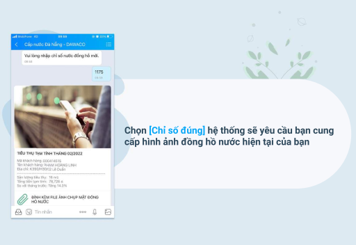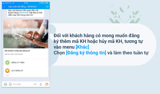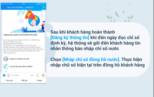 Ông Hồ Minh Nam, Tổng giám đốc Công ty chia sẻ thêm:“Việc thực hiện đăng ký báo chỉ số nước qua ZaloOA của DAWACO rất đơn giản, kể cả những người không rành công nghệ cũng có thể thao tác dễ dàng. Ngoài việc báo số nước, tra cứu tiền nước hàng tháng, đây còn là kênh để chúng tôi tiếp cận, trao đổi thông tin và tương tác 2 chiều với khách hàng, chúng tôi sẽ lắng nghe, và cải thiện các dịch vụ cấp nước ngày càng nhanh chóng và chuyên nghiệp hơn. Khách hàng cũng có lợi ích khi thực hiện đăng ký khi thông tin đối với các yêu cầu sửa chữa khi có sự cố về nước, nhận các thông báo về dịch vụ ngưng cấp nước nhanh chóng, kịp thời sẽ giúp cho khách hàng chủ động hơn trong việc sử dụng nước, đặc biệt có thể tự kiểm tra đối chiếu các chỉ số nước hàng tháng để có kế hoạch sử dụng nước an toàn, hiệu quả và tiết kiệm hơn…”.