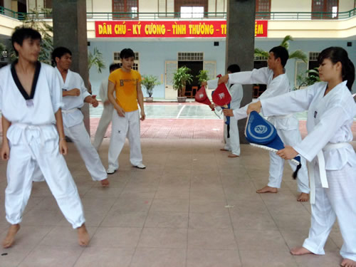 Suốt hơn 2 tháng nay, sảnh nhà Trung tâm văn hóa thuộc khu thể thao Tiên Sơn (Đà Nẵng) sôi động hẳn lên bởi lớp học Taekwondo miễn phí dành cho HSSV. 7 giờ tối, gần 100 học viên trang phục võ đường chỉnh tề luyện những động tác uyển chuyển, dứt khoát, đều đặn theo tiếng hô của võ sư huấn luyện. Thầy giáo Trần Đăng Khoa, Chủ nhiệm CLB Taekwondo miễn phí- Cán bộ phòng quản lý HSSV Trường CĐ Phương Đông bộc bạch: “Ban đầu ý tưởng thành lập CLB xuất phát từ suy nghĩ làm một cái gì đó tạo sân chơi cho HSSV, giúp các em khỏe mạnh để tập trung vào học hành. Đó cũng là giải pháp kéo các em ra khỏi những cuộc chơi vô bổ thâu đêm suốt sáng, ảnh hưởng đến sức khỏe và kết quả học tập”.