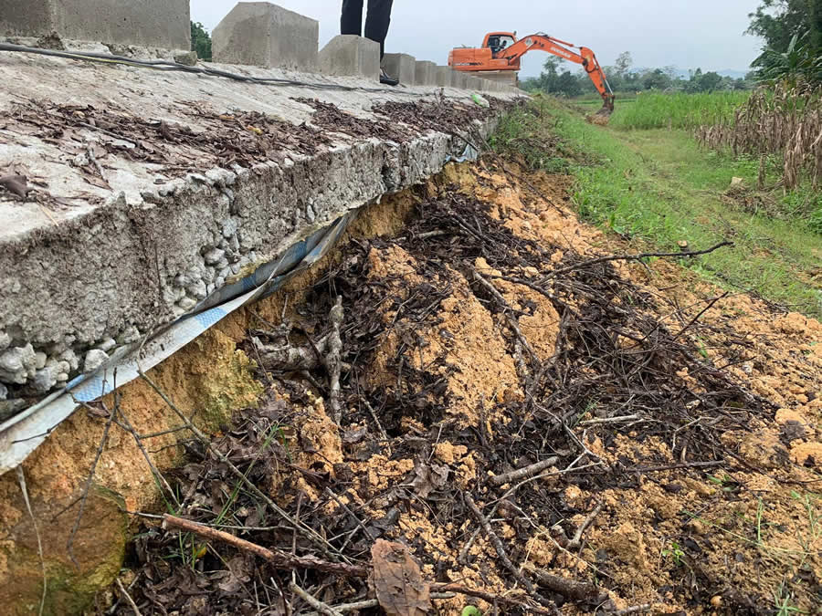 Phần mái đê phía đồng và mái đê phía sông đoạn không xung yếu được triển khai trồng cỏ. Tuy nhiên, chỉ vài trận mưa nhỏ đầu mùa, hai bên lề đã bị xói lở rất nặng. Nền đường nhiều đoạn bị khoét sâu vào khoảng trên 40cm, có chỗ khoét sâu vào bên trong, gây mất an toàn cho người dân mỗi khi qua lại. Để khắc phục vấn đề này, đơn vị thi công đã sử dụng máy xúc, múc đất từ dưới chân đê để đắp vào. Đây là loại đất phù sa có pha cát nên không đảm bảo chất lượng theo hồ sơ thiết kế. Phần gia cố bằng đá lát trong khung bê-tông cốt thép mái đê phía sông cũng không đạt yêu cầu do đá hộc không đủ lớn, sử dụng quá nhiều đá nhỏ để chèn, khi lũ về, nước chảy xiết rất dễ bị cuốn trôi. Đoạn gia cố bằng rọ đá có dấu hiệu bị sụt nền, tạo nên độ lệch về mặt bằng giữa khóa mái trên và rọ đá.