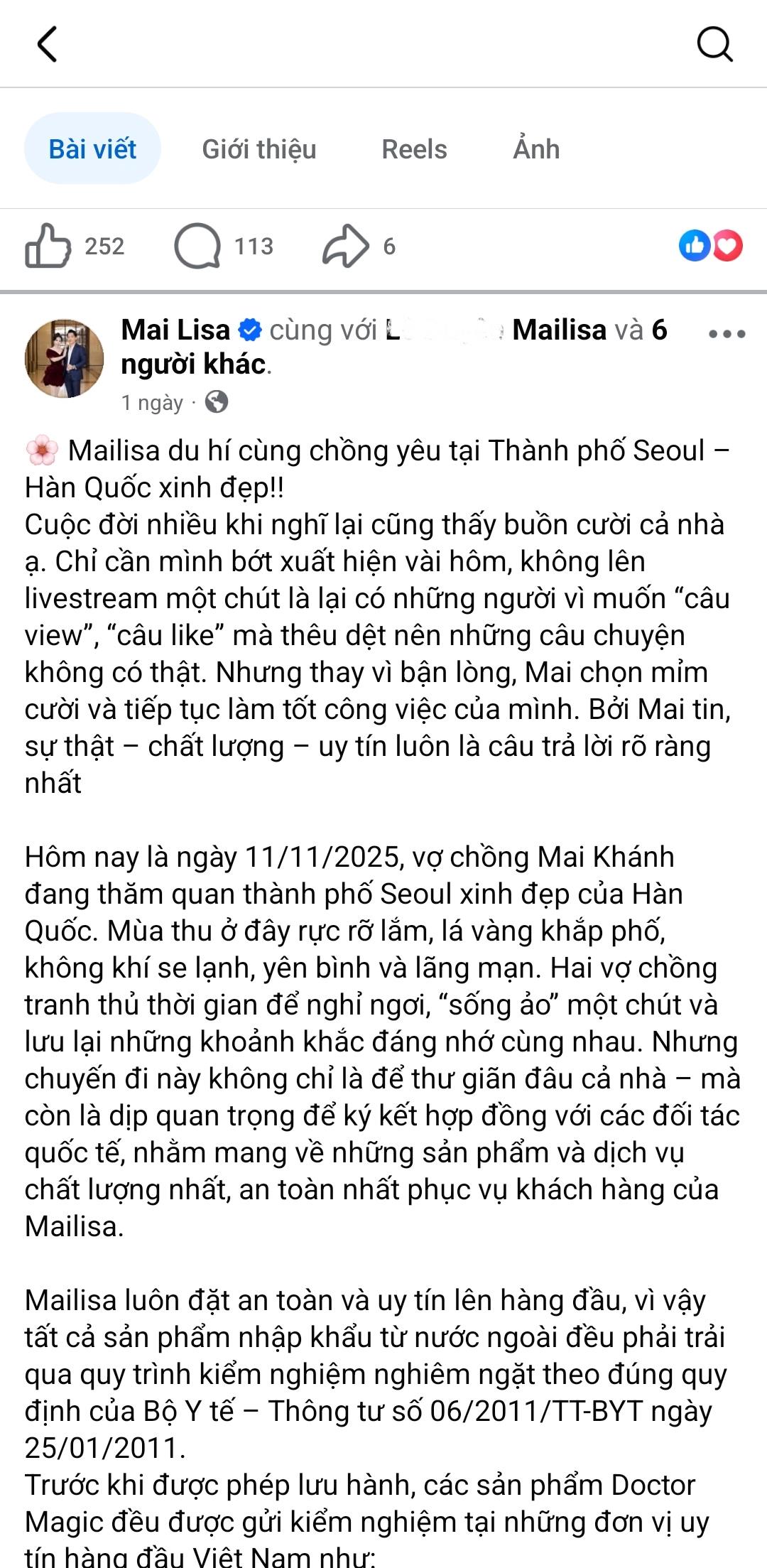Trong bài đăng này còn có đoạn: “Mailisa luôn đặt an toàn và uy tín lên hàng đầu, vì vậy tất cả sản phẩm nhập khẩu từ nước ngoài đều phải trải qua quy trình kiểm nghiệm nghiêm ngặt theo đúng quy định của Bộ Y tế – Thông tư số 06/2011/TT-BYT ngày 25-1-2011... Mai và anh Khánh chưa bao giờ xem nhẹ hai chữ “trách nhiệm” và “đạo đức nghề nghiệp”, luôn kiên định với triết lý: “Làm đúng để pháp luật bảo vệ mình – Làm đúng để khách hàng tin yêu mình”.