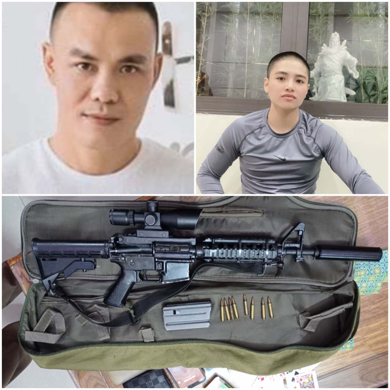 Đối tượng Nguyễn Hòa Minh (bên trái) và Võ Huỳnh Anh Tuấn cùng khẩu súng AR15 tang vật vụ án.