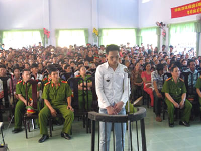 Hôm xét xử, hội trường UBND xã đông kín người, CAH Ninh Hòa và CA tỉnh Khánh Hòa phải bố trí một lực lượng khá đông để giữ gìn ANTT. Tại phiên tòa, Huỳnh Bá Nhẫn đã phản cung, không chịu thừa nhận hành vi phạm tội, mặc dù trước đó, tại CQĐT y hoàn toàn thừa nhận. Tuy nhiên, với những chứng cứ không thể chối cãi, vị đại diện VKS vẫn giữ quan điểm và tội danh truy tố đối với bị cáo Nhẫn.