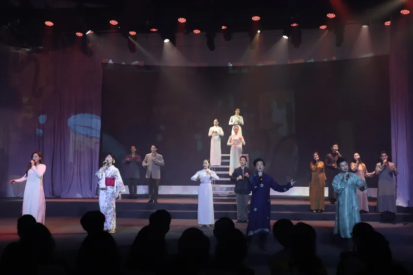 Ông Hoàng Tùng, Bí thư Đảng ủy phường An Khánh nhiệm kỳ 2025-2030 (thứ 3 từ trái sang) cùng gia đình Nhạc sĩ Trịnh Công Sơn và các nghệ sĩ sau đêm diễn. Ảnh: VĂN HÀ