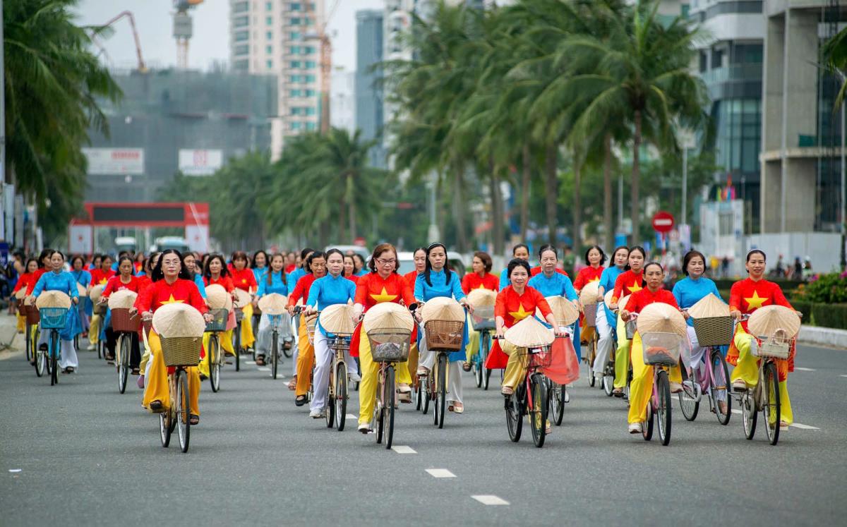 Trong đó, chương trình diễu hành áo dài với chủ đề "Dấu ấn Đà Nẵng - Hội tụ sông Hàn" do Hội Liên hiệp Phụ nữ TP tổ chức đã trở thành điểm nhấn ấn tượng. Hơn 1.000 phụ nữ tham gia đã tạo nên một "dải lụa" rực rỡ sắc màu trên các tuyến đường trung tâm. Những tà áo dài truyền thống, áo dài cờ đỏ sao vàng, áo dài thổ cẩm… hòa cùng nón lá, cờ Tổ quốc, lan tỏa niềm tự hào dân tộc và vẻ đẹp duyên dáng của người phụ nữ Việt.