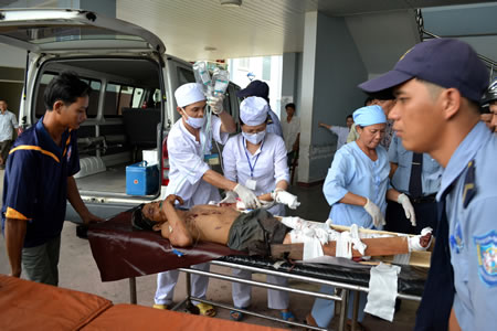 Nạn nhân Nguyễn Tấn Lưu trong cơn nguy kịch chuyển cấp cứu |