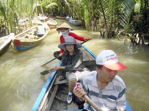 Tạm lùi xa phố xá Sài Gòn náo nhiệt, từ 6 giờ sáng, đoàn chúng tôi khởi hành trên chuyến xe du lịch bắt đầu hành trình đến với miền Tây. Đoàn chọn con đường hiện đại nhất là đường cao tốc Sài Gòn-Trung Lương, đến ngã ba Trung Lương dùng bữa điểm tâm rồi qua cây cầu Mỹ Thuận-cầu dây văng đầu tiên của nước ta để đến Tiền Giang bằng xuồng máy thăm cảnh làng quê miệt vườn trù phú, những dòng sông, kênh rạch chằng chịt xuyên chảy qua các cù lao, dừa nước bạt ngàn. Điểm dừng chân đầu tiên của đoàn là Tiền Giang, Bến Tre- vùng du lịch sinh thái không chỉ nổi tiếng với những miệt vườn nối tiếp nhau dài tít tắp đủ các loại cây trái, được ví như viên ngọc quý ở hạ lưu sông Tiền mà còn hấp dẫn với 4 cồn đất mang tên tứ linh: Long, Lân, Quy, Phụng, trong đó có 2 cồn hấp dẫn du khách nhất là Cù lao Thới Sơn (Tiền Giang) và Cồn Phụng, thuộc tỉnh Bến Tre. Diện tích khoảng 11km2, 7.000 dân trên Cù lao Thới Sơn sống bằng nghề trồng dừa nước, nhãn và nuôi ong lấy mật. Ngoài tham quan, mua sắm những sản phẩm du lịch làm từ dừa, du khách đến đây còn được thưởng thức văn hóa ẩm thực với các món đặc sản như mật ong phấn hoa, bánh tráng dừa, lẩu cá kèo, cá lóc hấp bầu, cá tai tượng chiên xù, mua những đồ dùng sinh hoạt, lưu niệm làm từ cây dừa nước và nghe những làn điệu cải lương từ các nhóm đờn ca tài tử. "Có những chàng trai coi thường con sóng dữ/những nữ anh hùng tóc dài chấm lưng thon/có phải vậy không hỡi người em gái nhỏ/tên tuổi lẫy lừng làm sáng cả non sông/... Lời ca ngân nga khiến ai nấy dùng dằng chẳng muốn rời chân.