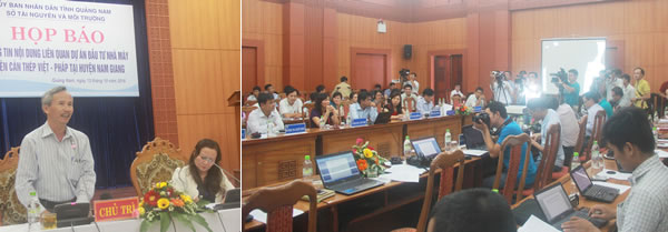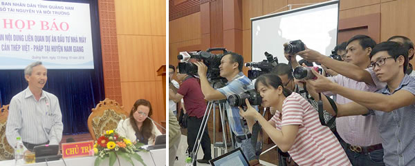 (Cadn.com.vn) - Chiều 13-10, Sở TN&MT tỉnh Quảng Nam tổ chức họp báo để thông tin nội dung liên quan Dự án đầu tư Nhà máy thép Việt Pháp của Cty TNHH Thép Việt Pháp (viết tắt: NMT V-P) tại thôn Hoa, thị trấn Thạnh Mỹ (H. Nam Giang, Quảng Nam). Phó Giám đốc Sở TN&MT Lê Thị Tuyết Hạnh và Tiến sĩ Huỳnh Ngọc Thạch đồng chủ trì buổi họp báo.