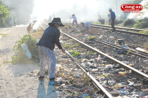 | Người dân Q. Thanh Khê dọn vệ sinh môi trường dọc tuyến đường sắt. |