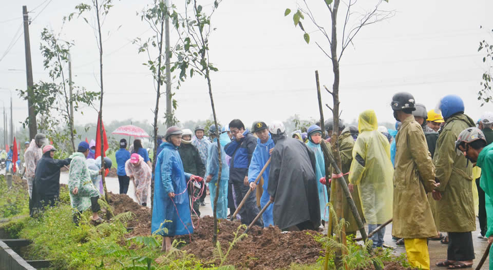 Người dân thôn 5 (xã Hòa Khương) ra quân trồng cây, tôn tạo cảnh quan làng quê. |