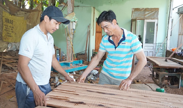 Lê Công Hoa hướng dẫn kỹ thuật cho học viên tại cơ sở mộc gia đình.