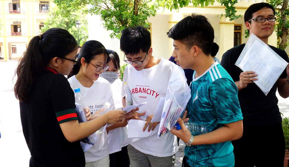 Các TS tại điểm thi Trường THPT chuyên Phan Bội Châu, Nghệ An thảo luận sau buổi thi môn Tổ hợp KHTN vào năm 2019. |