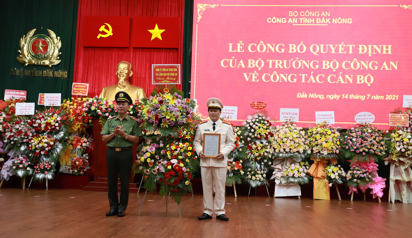 Chiều ngày 14/7, tại Công an tỉnh Đắk Nông, Bộ Công an tổ chức Lễ công bố Quyết định của Bộ trưởng Bộ Công an về công tác cán bộ. Trung tướng Trần Quốc Tỏ, Ủy viên BCH Trung ương Đảng, Phó Bí thư Đảng ủy Công an Trung ương, Thứ trưởng Bộ Công an chủ trì buổi lễ. Tham dự buổi lễ, có đồng chí Điểu K’ré - Ủy viên BCH Trung ương Đảng, Phó Bí thư Tỉnh ủy, đồng chí Hồ Văn Mười – Phó Bí thư Tỉnh ủy, Chủ tịch UBND tỉnh Đắk Nông, lãnh đạo tỉnh Quảng Bình, lãnh đạo một số Cục nghiệp vụ Bộ Công an; lãnh đạo, nguyên lãnh đạo Công an tỉnh Đắk Nông, Đắk Lắk, Quảng Bình,....
