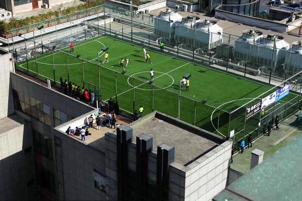 Các tòa nhà cao tầng thường không có đủ không gian cho một sân bóng đá. Và đó là lý do tại sao một sân bóng đá đã "mọc lên" trên tầng thượng của tòa nhà trung tâm thành phố Kim Hoa, tỉnh Triết Giang, Trung Quốc như thế này. Giới chức một trung tâm mua sắm đã xây dựng sân bóng này cho nhân viên văn phòng giải trí và vui chơi sau giờ làm việc.