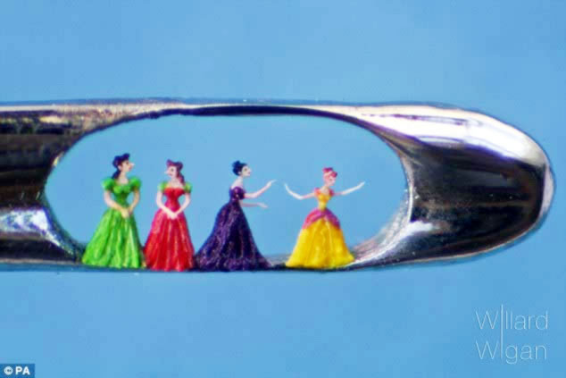 (Cadn.com.vn) - Bạn phải dùng kính hiển vi mới có thể nhìn thấy chúng. Các tác phẩm nghệ thuật siêu nhỏ được làm thủ công bởi Willard Wigan, từ Birmingham (Anh) nằm bên trong mắt của một cây kim và được các chuyên gia mô tả là "kỳ quan thứ tám của thế giới". Ông Wigan lần đầu tiên quan tâm đến nghệ thuật vi điêu khắc cách đây 5 năm khi ông bắt đầu làm nhà cho kiến vì ông nghĩ rằng chúng cần nơi để sống.