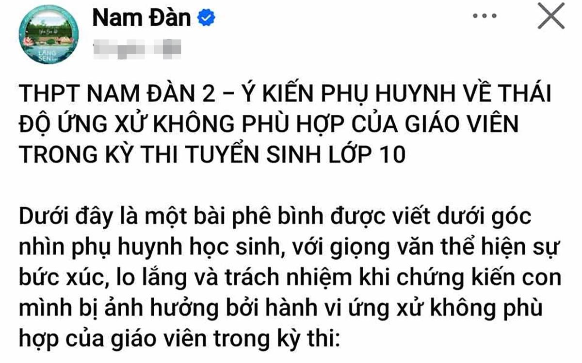 Phụ huynh này có con là thí sinh dự thi tại điểm thi Trường THPT Nam Đàn 2. Theo phản ảnh của phụ huynh này, kết thúc môn thi Ngữ Văn sáng 3-6, con mình trở về nhà với tâm lý buồn bã, hoang mang và cảm giác bị tổn thương vì lời nói, thái độ thiếu tôn trọng từ một giám thị trong phòng thi… Cụ thể, trong quá trình làm nhiệm vụ coi thi, khi một thí sinh xin thêm giấy thi, thay vì hỗ trợ hoặc động viên, thầy giáo T.V.D (công tác tại Trường THPT Nam Đàn 2) lại buông câu: “Học chi cho lắm rồi cũng đi làm thuê, công nhân”.