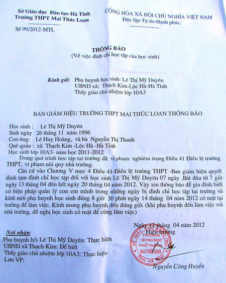 Chưa hết ngỡ ngàng vì những “chất vấn” vô lý đến nực cười của Hiệu trưởng Nguyễn Công Huyền thì anh Hoàng và cháu Duyên lại tiếp tục nhận một cú “sốc” khi nhận được thông báo của nhà trường về việc buộc thôi học đối với cháu Duyên vì vi phạm nội quy của trường. Trao đổi với chúng tôi, anh Hoàng uất ức, chỉ biết hỏi rằng “tại sao nhà trường lại có kết luận vô lý đến vậy?”. “Xét thấy thông báo của BGH Trường THPT Mai Thúc Loan không đúng với sự việc xảy ra. Duyên là người bị hại, song nhà trường gửi thông báo tạm đình chỉ việc học của cháu Duyên là sai hoàn toàn, nên tôi kiến nghị nhà trường rút lại thông báo, đồng thời kiến nghị với Sở GD-ĐT, Cơ quan CSĐT CAH Lộc Hà, Ban CAX Thạch Kim làm rõ sự việc” - anh Hoàng cho biết. Cũng theo anh Hoàng, việc làm của BGH Trường THPT Mai Thúc Loan là thiếu trách nhiệm. Sau khi sự việc xảy ra, gia đình đã báo với chính quyền địa phương và BGH Trường THPT Mai Thúc Loan, vậy nhưng khi “triệu tập” anh lên làm việc thì hiệu trưởng lại vặc: “sao không báo nhà trường?”.