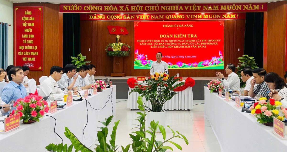 Chiều ngày 21-4, Phó Bí thư Thường trực Thành ủy Nguyễn Đình Vĩnh làm trưởng đoàn kiểm tra theo Quyết định số 712-QĐ/TU ngày 10/4/2026 của Ban Thường vụ Thành ủy, chủ trì làm việc với Ban Thường vụ Đảng ủy 4 phường, xã: Hòa Khánh, Liên Chiểu, Hải Vân, Bà Nà.